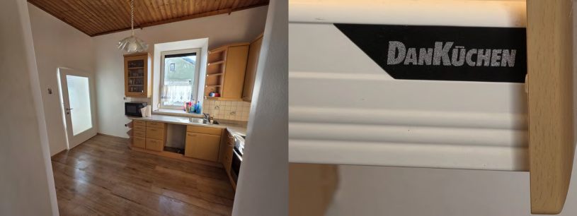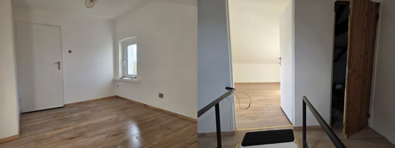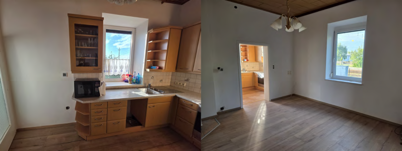 Erdgeschoss: Vorraum, Bad, separates WC, Flur mit Aufgang ins Dachgeschoss (steile Stiege), Küche mit moderner Einbauküche, großzügiges Wohnzimmer sowie ein separates Schlafzimmer.